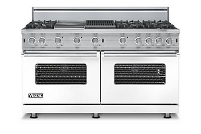 Viking VGCC5606GQWH: 60" Custom Sealed Burner Range, Natural Gas, No Brass Accent . Viking White Freestanding Gas Range VGCC5606GQWH. Exclusive VSH (VariSimmer-to-High) Pro Sealed burner System. Front right burner equipped with TruPower Plus 18,500 BTU burner. Burners equipped with 15,000 BTU's. Exclusive VariSimmer setting for all burners. Exclusive all burners equipped with SureSpark Ignition System for consistent and reliable ignition. Automatic re-ignition. Surface burners light at any position on the knob and re-light if extinguished even on lowest setting. Heavy-duty metal knobs with stainless steel finish shipped standard. Exclusive combination of single 30,000 BTU U-shaped burner and infrared broiler with SureSpark Ignition System. GourmetGlo Infrared Broiler provides intense searing heat for broiling applications. Large-capacity ovens with six rack positions (see specifications for oven interior dimensions). Six high performance cooking functions for right oven. Natural airflow bake. Convection bake. Infrared broil. Convection infrared broil. Convection dehydrate. Convection defrost. All convection functions utilize the ProFlow Convection Air Baffle. Specifically designed to ensure balanced airflow for even heat distribution. Convection fan switch conveniently located on control panel. Heavy-duty broiler pan/grid. Two halogen oven lights for excellent visibility throughout the oven cavity. Exclusive one-piece tooled and porcelainized cooking surface for easy cleanup. Burner caps are easily removable for quick cleaning. Heavy-duty, porcelainized, cast-iron removable surface grates. Provides continuous front-to-rear, left-to-right surface for easy movement of large pots. One-piece control panel assembly easily removable for convenient front access. Commercial-grade, machined steel construction with Blanchard finish to retain cooking oils for stick-resistant cooking. Thermostatically controlled for precise temperatures. Exclusive cast grease trough holds 2-1/2 cups of liquid and can be easily removed from the front of the griddle for cleaning