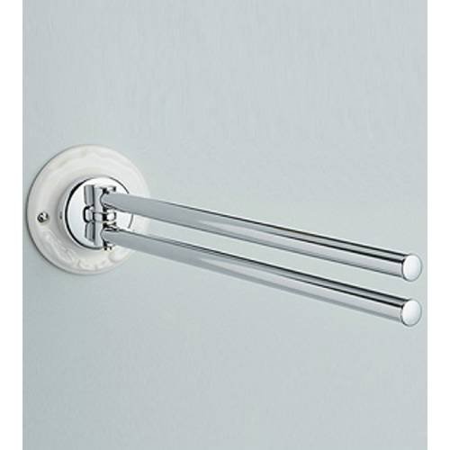 Herbeau 112505-70 Sceau Rose/ Weathered Brass Charleston Pivotable Towel Bar 1125?Charleston Pivotable Towel BarPivotableBar Thickness: 5 8 Collection: Charleston Finish: Polished Chrome, Solibrass, Old Gold, Old Silver, Polished Brass, Polished Nickel, Brushed Nickel, Satin Nickel, Weathered Brass Patterns: Moustier Polychrome, Moustier Bleu, Moustier Rose, Vieux Rouen, Sceau Rose, Sceau Bleu, Berain Rose, Berain Vert, Berain Bleu, Romantique, Rouen Marly, Plain White, Avesnes Projection: 16-3 4 Type: Double Wall Escutcheon Width: 2-5 8Shown in Plain White and Polished Chrome