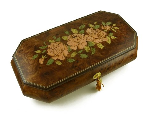 #This beautiful and spacious musical jewelry box is a perfect gift for your special someone. This gorgeous musical jewelry box features a wood inlay design of 3 magnificent pink roses aligned a harmonious fashion. It's set against a medium wood tone background and is hand-made in Sorrento, Italy. It's constructed of solid Burl-elm and rosewood. It also has a fully functional lock and key to secure those precious items. This music jewelry box can be fitted with either an 18, 22, 30 or 36 note movement. Please refer to appropriate item page (22, 30, 36 Note listings - Please see tab below) for pricing. Thank you very much; your interest is appreciated in our art! Your satisfaction is always guaranteed at The Attic, let us know what we can do for you... Dimensions: Length - 11"Width - 5.25"Height - 2.25"