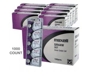 1000 pcs Maxell SR44W SR44 357 V357 Silver Oxide Watch Battery For applications with a continuous, low power consumption such as analog watches and digital watches without additional functions. The Maxell SR41W is a popular high-drain Silver-Oxide cell commonly used in watches, with a shelf life of 5+ years. Diameter: 11.6 mm. Height: 5.4 mm. Features case of 200 tear strip retail card 5 packs (10 boxes of 20 x 5pk batteries totals 1000 batteries). Also Known As: 10 L 14/D 357, 1128MP, 1130SO, 1131SO, 1166A, 157, 228, 280-08, 280-62, 280-8, 303, 357, 357BP, 4276, 541, 675, A, A-76, A76, A76-1, AG-13, AG13, CR44, D303, D303/357, D357, D357/303, D357H, D76A, EPX76, G13, G13A, GP76A, GPA7, GPA76, GS13, GS14, J, KA, KS76, L 1154, L1154, LR1154, LR-44, LR44, LR44H, MN44, MS76, PX675A, PX675S, PX76, PX76A, R 303/9, R 357/7, RPX675, RW 32, RW 42, RW82, RW82B, S06, S303/357, S76, SB-A9, SB-B9, SP303, SP357, SR 44, SR 44 W, SR1154, SR44, SR445W, SR44H, SR44SW, SR44W, SR47, SR76E, V13GA, V303, V357, WS 14/D 303, WS16