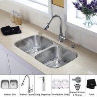 32 inch Undermount Double Bowl Kitchen Sink with Chrome Faucet and Soap Dispenser . KBU22-KPF1650-KSD30CH Features: -Number of holes: 4.-Add an elegant touch to your kitchen with unique Kraus kitchen combo.-Padded and Stone Guard undercoated insulation over a rubber pad reduces noise while sink is in use.-Certified and Listed by UPC, cUPC, CSA, IAPMO, ANSI and SCC.-Fits 33 inches cabinet.-Features dual pull-out spray head with an aerated flow or a powerful spray.-Spring-tensioned retractable hose.-Spout swivels 180-degrees.-Contains Sedal drip-free ceramic cartridge.-Hermetically sealed with adjustable temperature and flow rate limitation<.-2.2 GPM flow rate.-Single-lever water and temperature control.-Single-hole, top-mount installation.-Water pressure tested for industry standard.-Standard US plumbing connections.-Installation in a 1.375-inch hole.-ADA compliant.-Hose measures 24 inches long.-Spout reach: 7.9 inches.-Easy-push, self-priming pump.-Swivels 360 degrees.-Refillable from above.-Holds 14 ounces of liquid.-Requires 1.25-inch hole.-Measures 2.1 inches high x 3.5 inches deep. Includes: -Set of stainless steel bottom grids with protective feet and bumpers stainless steel basket strainer, stainless steel strainer and dish towel are included.-Mounting and installation brackets, cutout template are included.-All mounting hardware and hot/cold waterlines are included. Construction: -Kraus kitchen sink boasts 16-gauge premium grade T-304 stainless steel construction with an 18/10 chromium/nickel composition.-Faucet is constructed from solid brass with stunning triple plated chrome finish.-Soap Dispenser is constructed from solid brass with stunning triple plated chrome finish. Color/Finish: -Scratch-resistant commercial-grade premium satin finish. Specifications: -Overall sizes: 9 inches H x 18.5 inches W x 32 inches L.-Bowl sizes: 9 inches H x 16.5 inches W x 14.5 inches L.-Bowl sizes: 9 inches H x 16.5 inches W x 14.5 inches L. Dimensions: -Faucet height: 15.5 inches.-Spout height: 8.1 inches. Collection: -Kitchen Combo collection. Warran